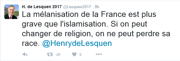 il se croit aux States, il doit visiter quelques sites précis...où il y a une liberté d'expression et où on  peut se vautrer à cœur joie dans la négrophobie...comme partout dans le monde d'ailleurs....rien à dire à Daesh ? rien sur le prophète ? petit joueur va !